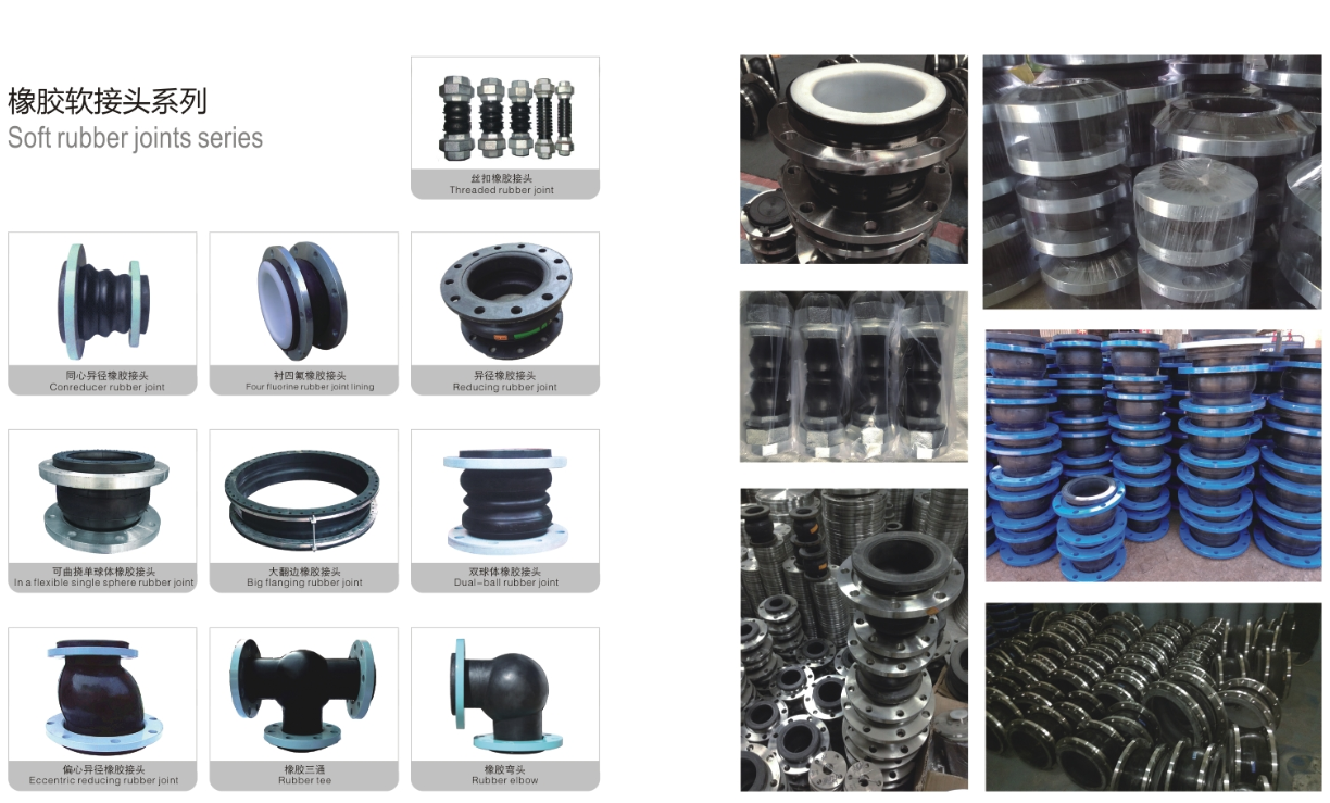 橡胶软接头是由内外层胶、帘布层和钢丝圈组成管状橡胶件,经硫化成型后再与金属法兰或平行接头松套组合而成。此产品可降低振动及噪声,并可对因温度变化引起的热胀冷缩起补偿作用,广泛应用于各种管道系统。与泵、阀门的连接、消防器材,震动较大的管道、冷热变化频繁的管道。主要用于原水和污水的提升和输送,火力发电厂的给水和冷却循环水,冶金行业,冷凝水,化工行业的化学物质的管道输送,石化行业的冷却,稀释及其它行业长短距离管线间的柔性连接。因为橡胶具有较高的耐磨性,还适用于一切行业的粒状和粉状及汽体的低温输送。