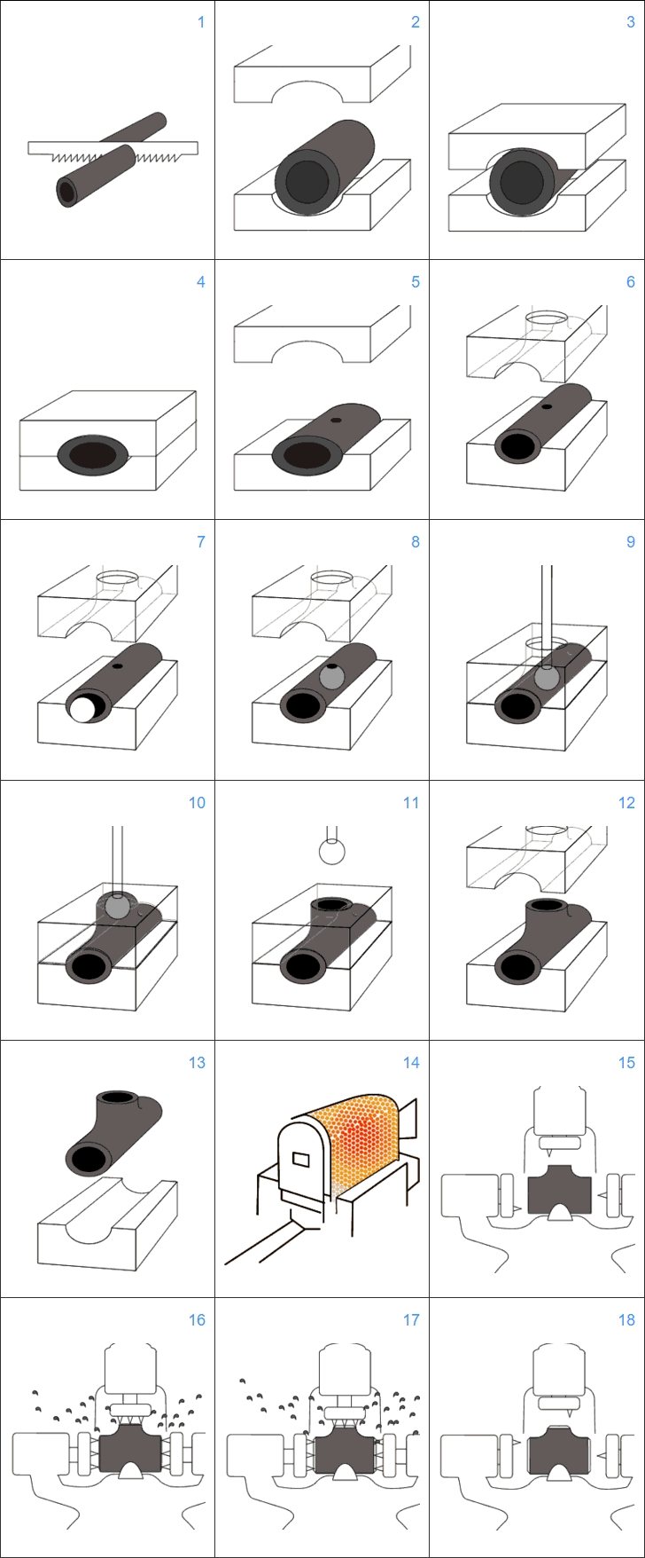Tees using raw material with a bigger diameter than the finished product, the branch outlet is extruded from pipe while the main body is being pressed.