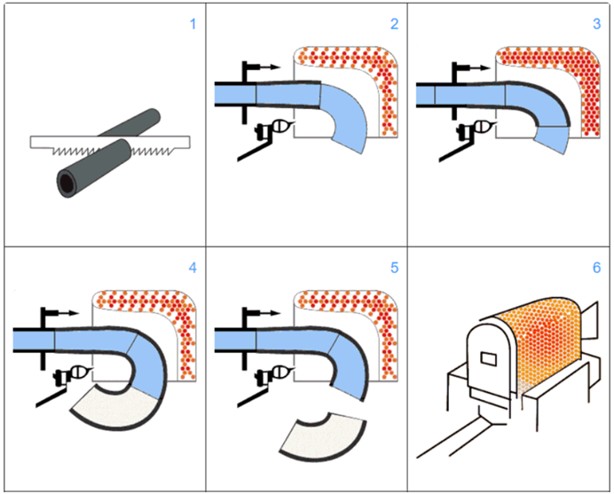 After heating the raw material, it is pushed over a die called "mandrel" which allows the pipe to expand and bend simultaneously. Applicable to a wide size range.
