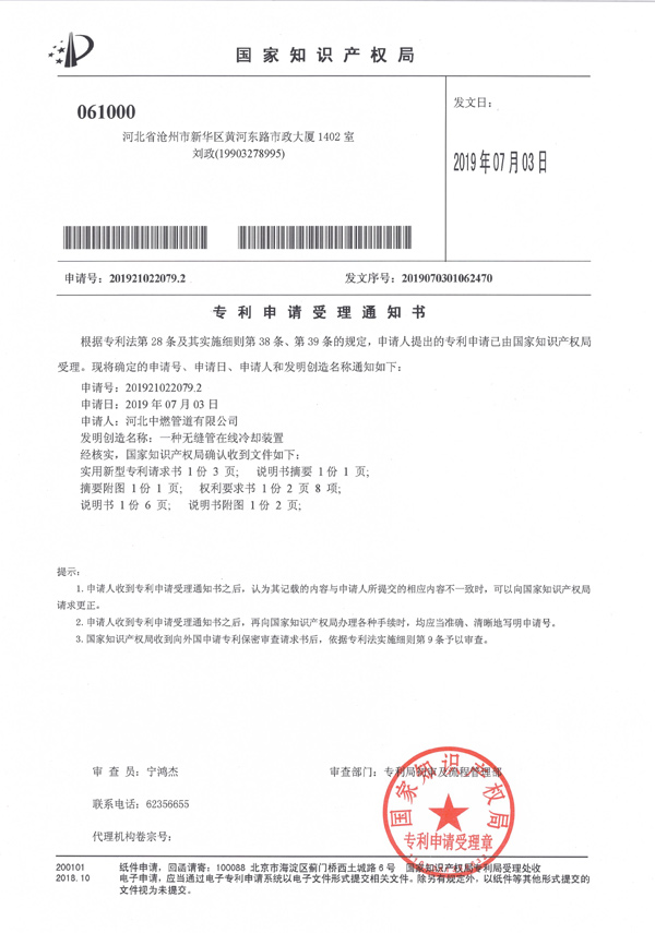 "A kind of seamless steel pipe online cooling device" patent application acceptance notice -