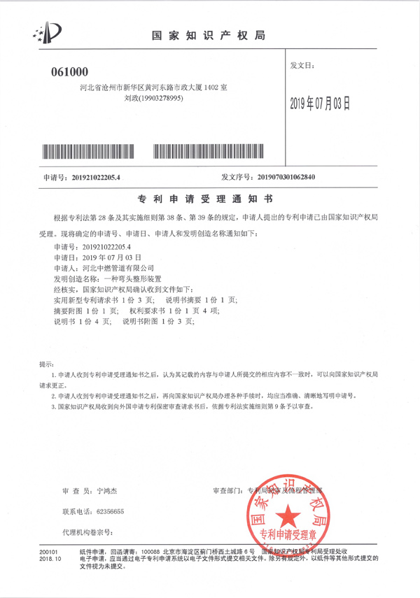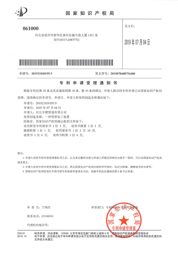 "A Pipe Bending Device"Notification of Acceptance of Patent Application for -