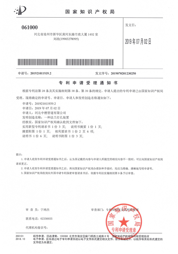 "A Flange Perforating Device"Notification of Acceptance of Patent Application for -